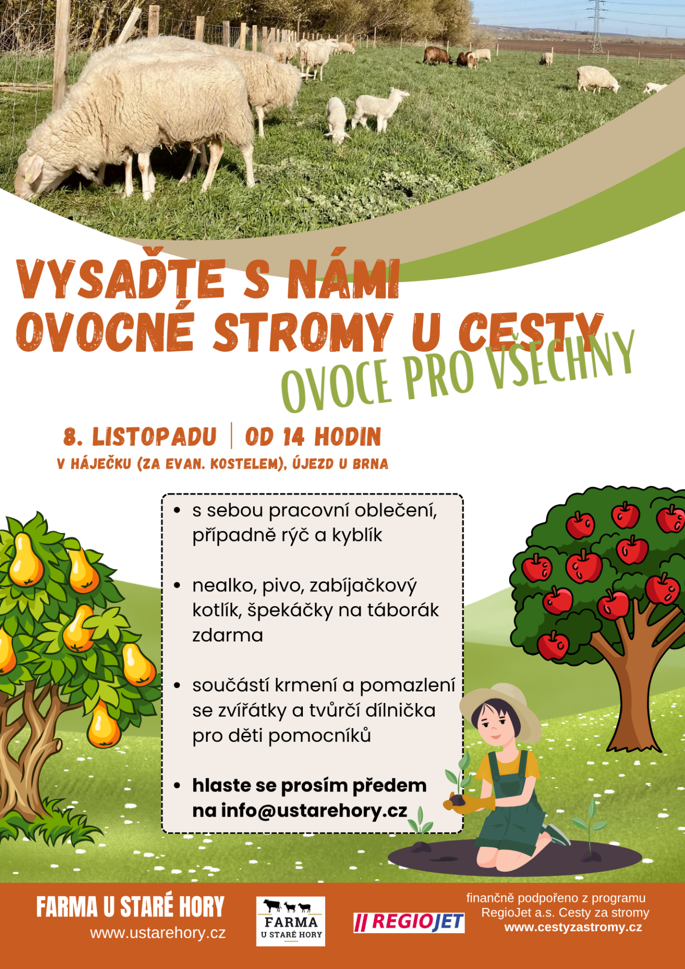 Výsadba bude probíhat v sobotu 8. 11. 2025 od 14 hodin v blízkosti háječku. Pro všechny pomocníky bude k dispozici zdarma nealko, pivo, zabíjačkový kotlík a špekáčky na závěrečný táborák. Jsou vítané i malé děti pomocníků, které se mohou pomazlit nejen se zvířaty, ale bude pro ně připravena i tvůrčí dílnička.